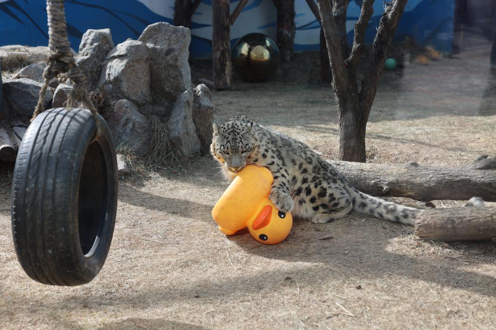 雪豹“凌小蟄”在雪豹館內(nèi)和“大黃鴨”玩具玩耍。