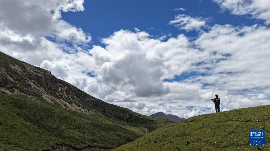 在青海省玉樹藏族自治州雜多縣昂賽鄉(xiāng),次丁在巡護(hù)中拍照(2025年8月9日攝,無人機照片)。新華社記者 齊芷玥 攝
