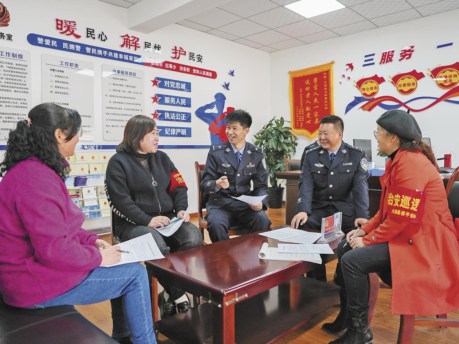 “小高警務(wù)室”與社區(qū)工作人員商討入戶反詐宣傳工作。