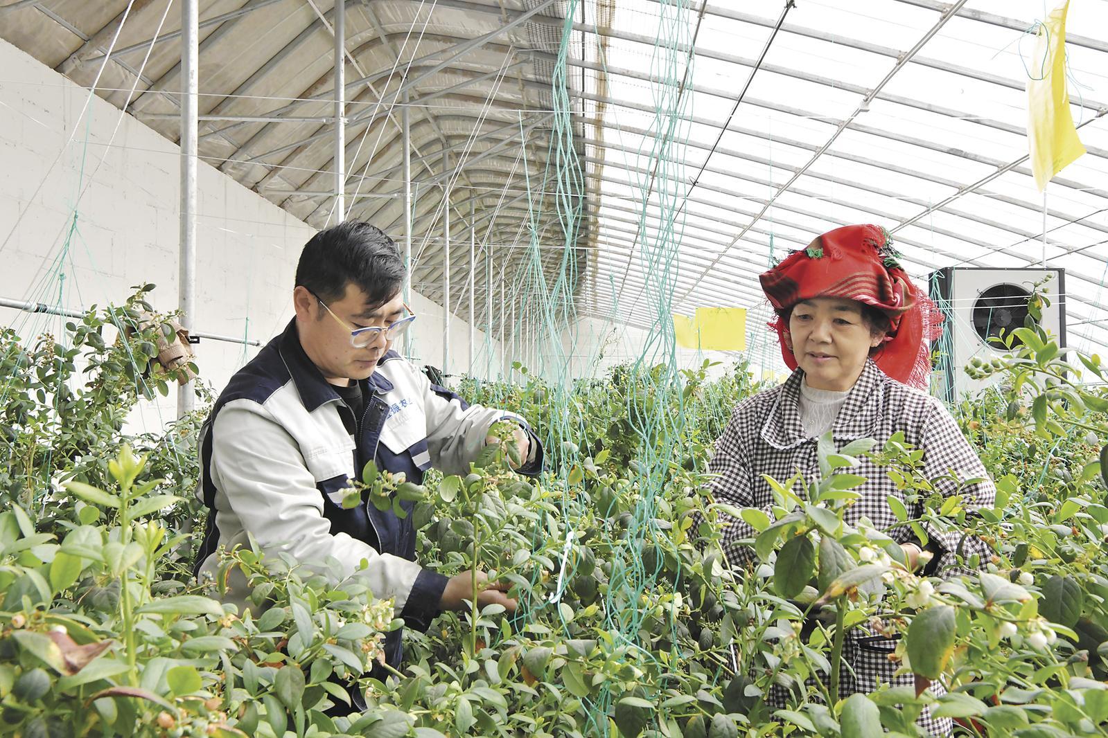 技術(shù)員指導(dǎo)村民為藍(lán)莓吊枝。
