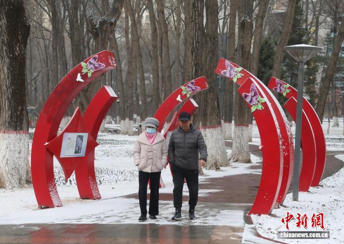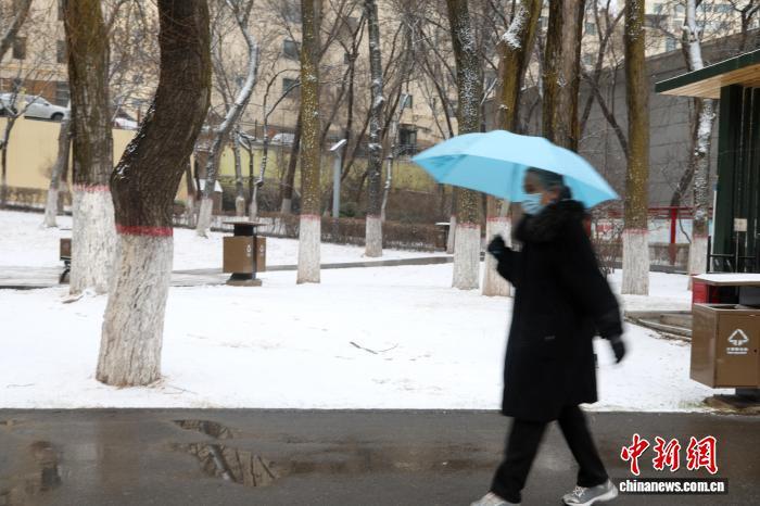 3月17日,受冷空氣影響,青海省西寧市迎來(lái)降雪,市民在人民公園內(nèi)散步。中新社記者 張忠蘋 攝