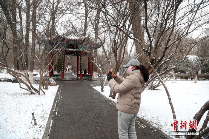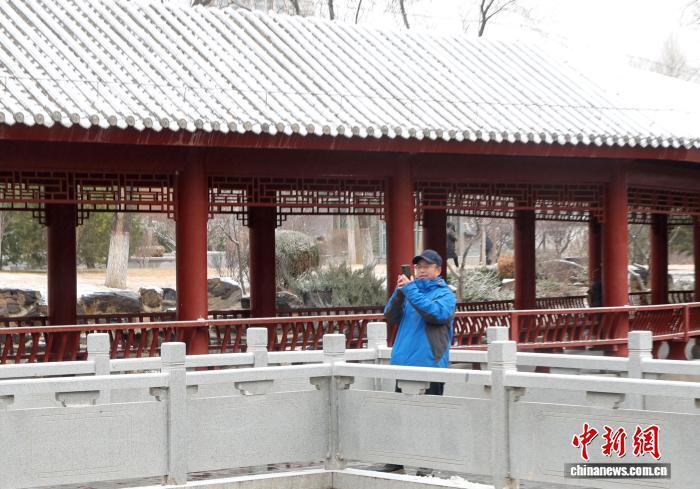 3月17日,受冷空氣影響,青海省西寧市迎來(lái)降雪,市民在人民公園內(nèi)賞雪景。中新社記者 張忠蘋 攝