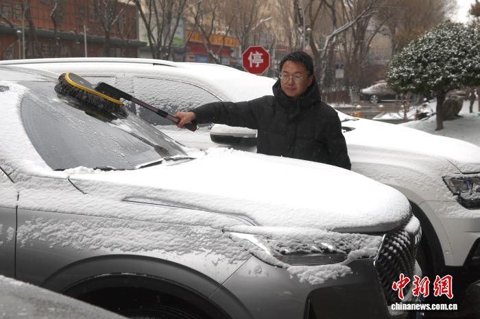 3月17日,受冷空氣影響,青海省西寧市迎來(lái)降雪,市民在清掃汽車上的積雪。中新社記者 張忠蘋 攝