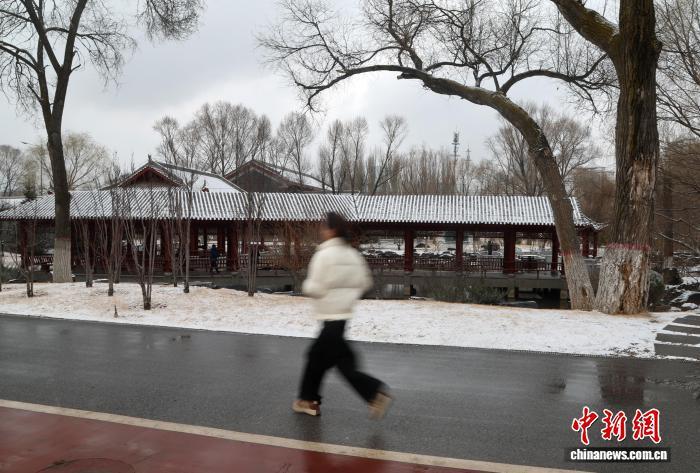 3月17日,受冷空氣影響,青海省西寧市迎來(lái)降雪,市民在人民公園中跑步。中新社記者 張忠蘋 攝