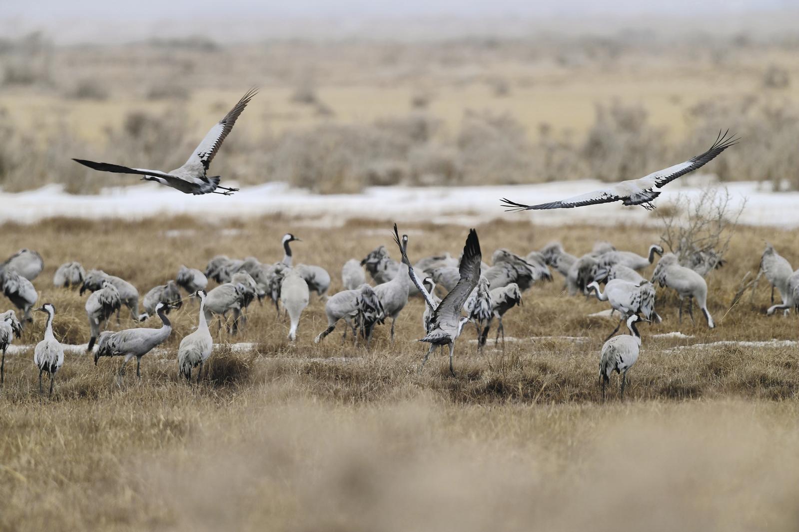 都蘭縣巴隆鄉(xiāng)林業(yè)站站長羅文華介紹:“今年天氣轉(zhuǎn)暖早,灰鶴來得比往年略早一些。估計到4月初就會全部飛走。目前我們粗略統(tǒng)計,數(shù)量已有5000多只?!?/p>
