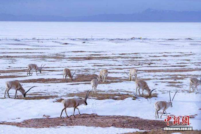 2023年3月25日,成群的藏羚羊在位于青海省玉樹藏族自治州的世界自然遺產(chǎn)地可可西里覓食。馬銘言 攝
