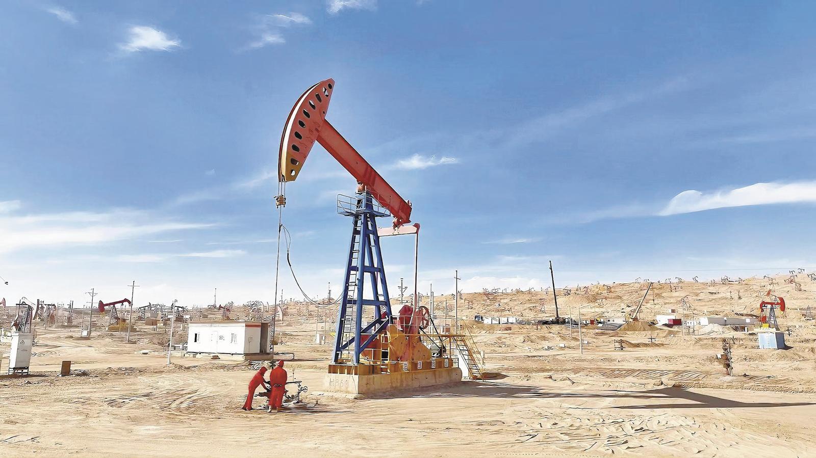 青海油田采油一廠油砂山運(yùn)維中心崗位員工在生產(chǎn)現(xiàn)場查看光桿是否存在偏磨情況。通訊員 朱智杰 攝