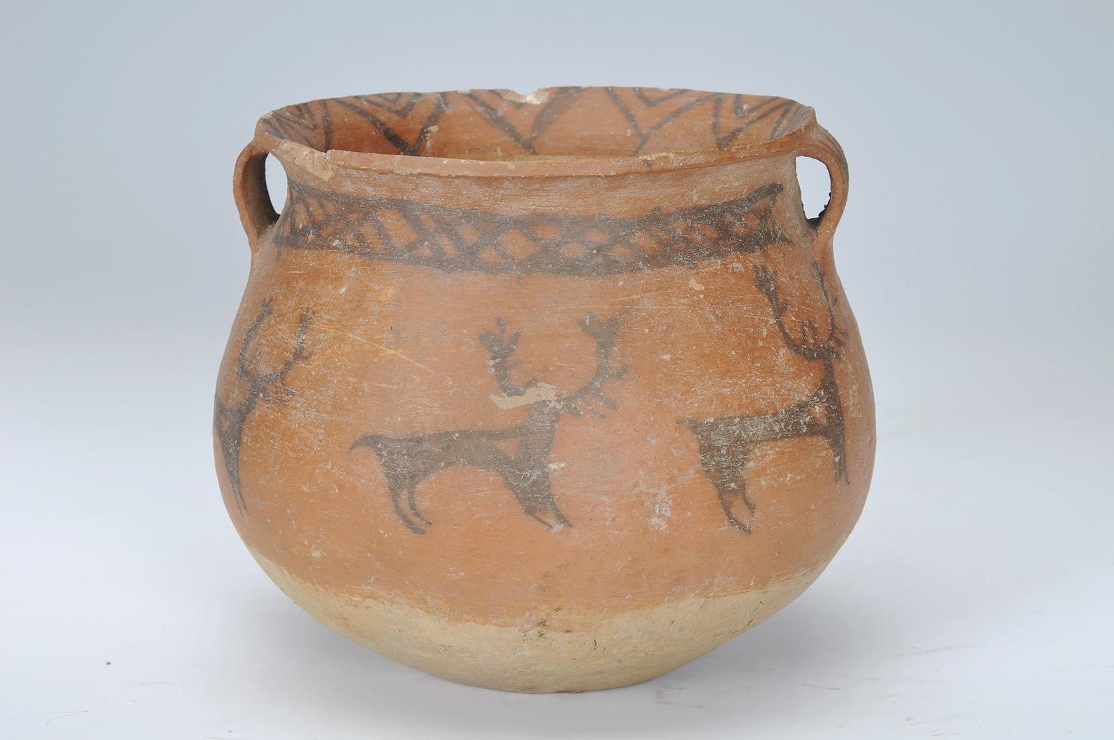 卡約文化鹿紋雙耳彩陶罐。