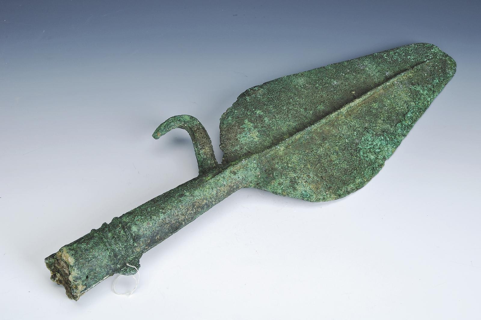 西寧市沈那遺址出土的圓銎寬葉倒鉤銅矛。