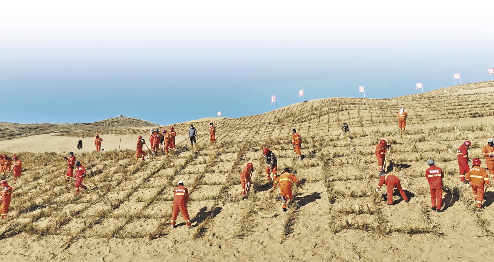 這種因地制宜的創(chuàng)新治理模式,將傳統(tǒng)尼龍袋沙障替換為可降解的稻草方格和高低立式防沙網(wǎng)等7種本地化高效措施,同步推行“以路治沙”,既保障了施工效率,又夯實(shí)了管護(hù)基礎(chǔ)。