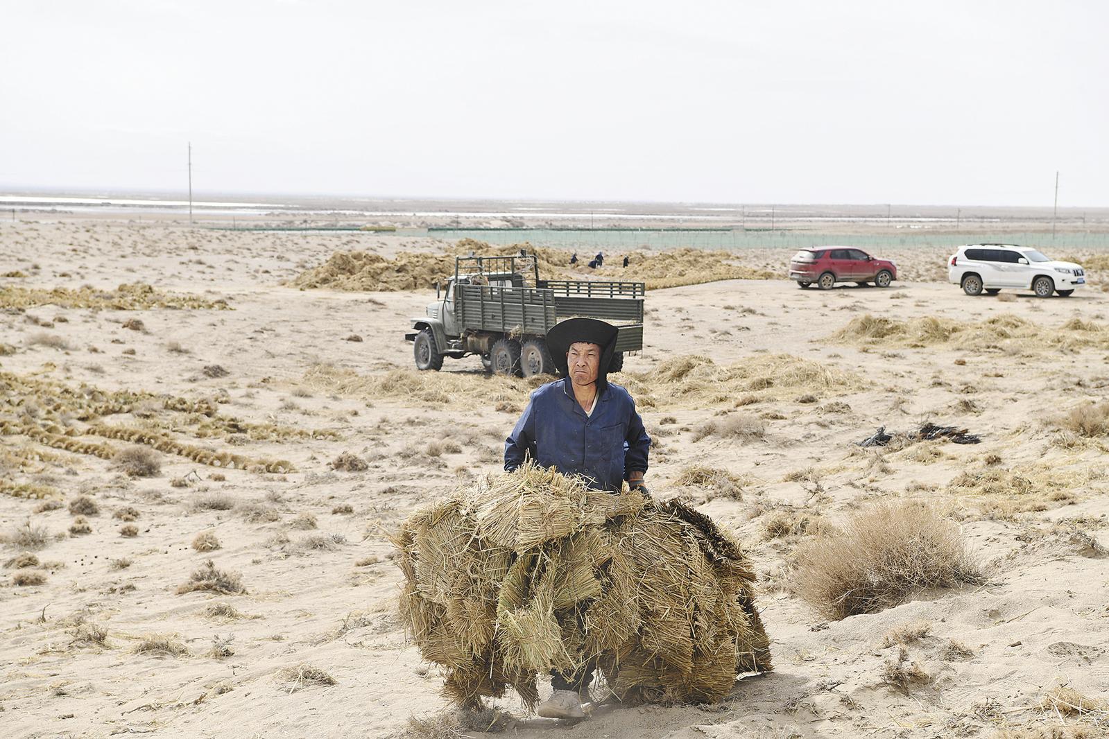 春雪初融,風(fēng)沙愈烈。香日德河流域的沙地上,狂風(fēng)裹挾著沙礫呼嘯而過(guò),打在臉上又澀又疼。十幾個(gè)從四川大涼山趕來(lái)的工人,佝僂著身子在沙地里忙碌,手里攥著草繩一排排平鋪,再用折彎的鐵鉤將草繩牢牢壓進(jìn)沙層,織就連片相連的草方格沙障。
