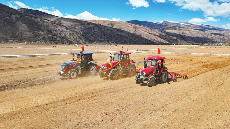 當(dāng)?shù)卮迕耨{駛農(nóng)機(jī)在田間作業(yè)。洛絨尼瑪 攝