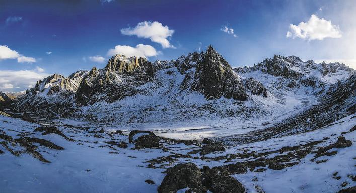 向?qū)е赶蛞惶幵旗F繚繞的絕壁,說(shuō)那里留有雪豹的足跡。我們雖未得見(jiàn)這位高山隱士的真容,卻望見(jiàn)了它的鄰居——巖羊。它們?cè)诮醮怪钡难卤谏先缏钠降兀液值拿c山巖渾然天成,唯有當(dāng)它們驀然回首,那對(duì)優(yōu)雅的彎角悄然劃破空氣時(shí),你才驚覺(jué),這片凝固的時(shí)空里,生命始終在流動(dòng)。
