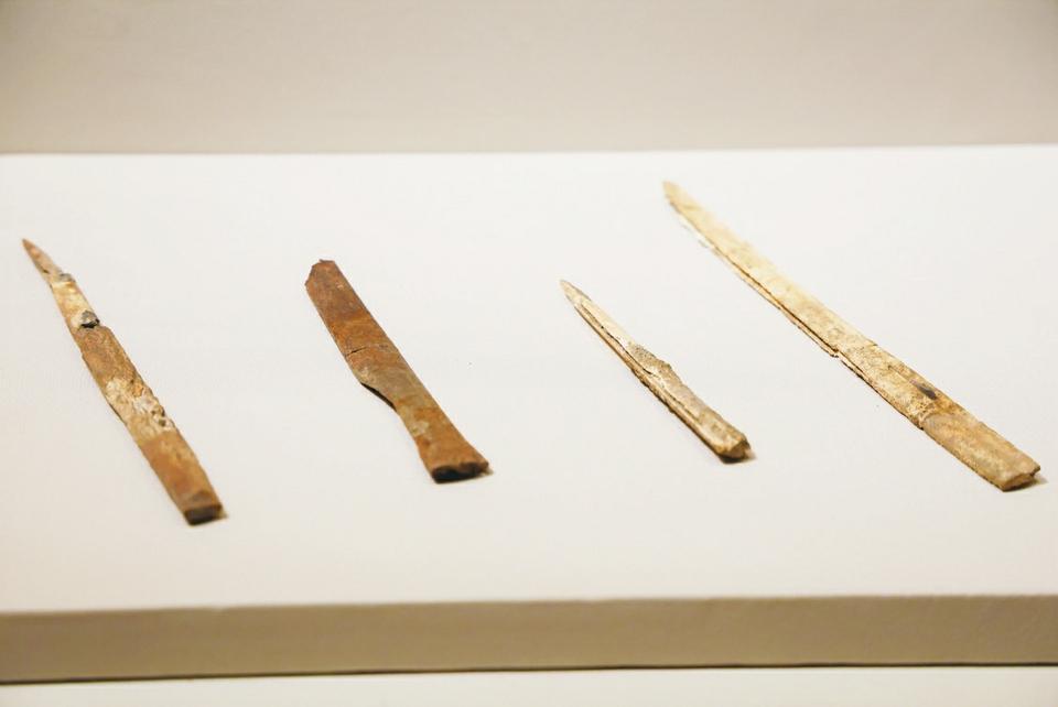 “我們可以看到展出的骨梗石刃刀,是由兩種材質(zhì)制作而成的?!爆F(xiàn)場(chǎng),四川博物院講解員趙國(guó)美向記者介紹,孔龍村先民們?cè)谥谱鬟@一器物時(shí),先將骨頭人工打磨出一個(gè)凹槽,再將磨制好的石片嵌在凹槽中,變成了組合器?!肮穷^的韌性很強(qiáng),不易斷,石頭又很鋒利,兩者的結(jié)合規(guī)避了單一工具的缺陷,體現(xiàn)了孔龍村先民們的智慧。”