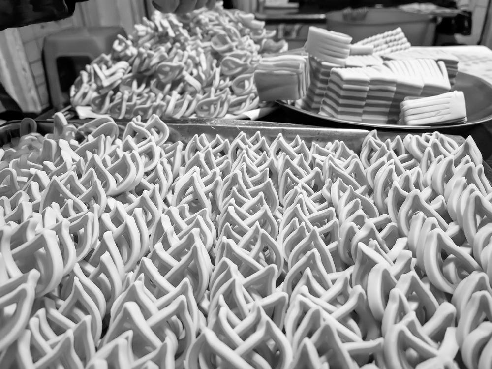 每天早上,她就準(zhǔn)備好雞蛋、白糖、酥油、化油去加工果子面皮。“以前,我們小時候,家家戶戶做果子都是全手工,自己和面、搟皮。那個時候條件不好,過年做果子只有一小坨面,炸好的果子要留到春節(jié)期間,那時候能吃到果子是特別開心和幸福的?!苯獣原傉f,現(xiàn)在條件好了,果子是想吃多少做多少,做果子也比以前方便了,很多都是機(jī)器和面、搟皮,自己只需要切面、翻花。