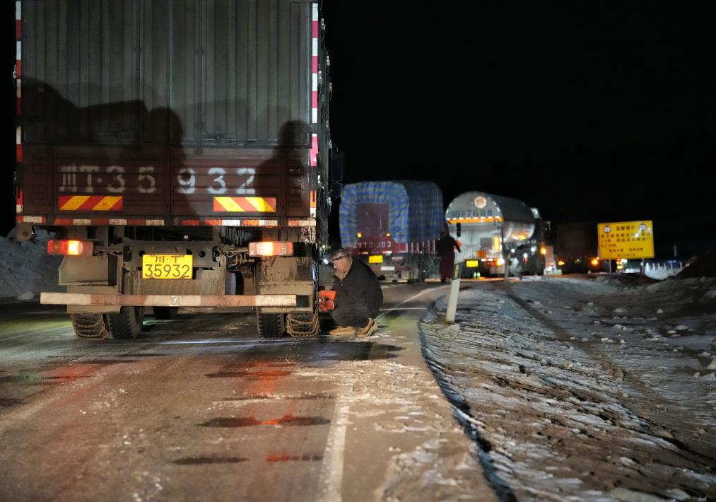 1月30日晚,折多山雪夜中,司機(jī)們紛紛停車安裝防滑鏈。新華社記者 劉坤 攝