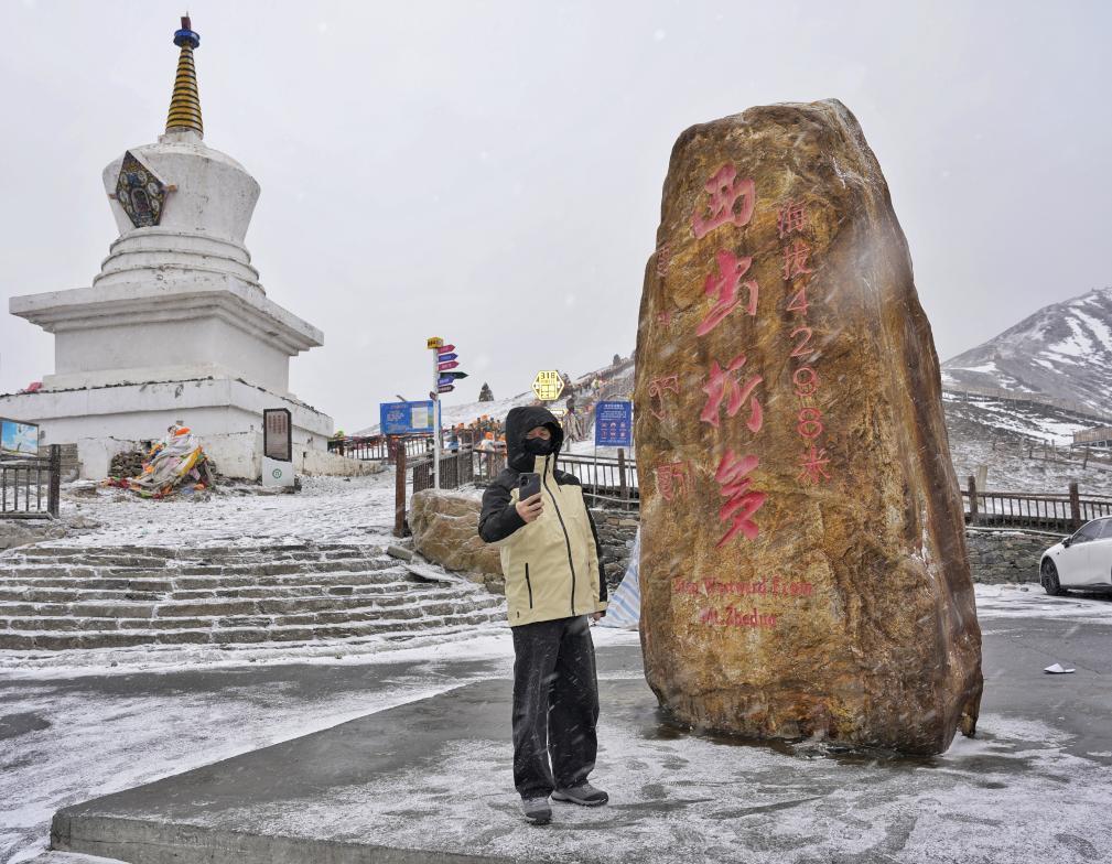 1月30日,游客正在折多山埡口處“西出折多”碑前打卡拍照。新華社記者 劉坤 攝