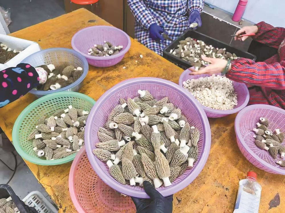 村民正在剪切羊肚菌?!±钜嘴洹z