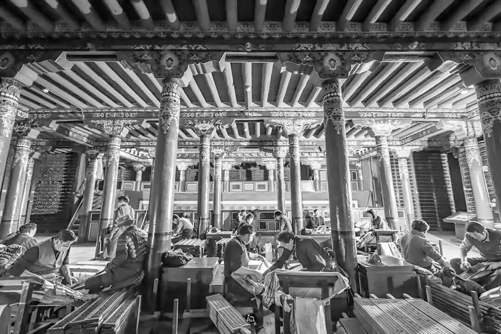 “每一刀下去,都是和祖先的對話?!痹嗾龑⒅讣獬寥胱詈笠粔K2025年復(fù)刻雕版的溝壑中。目前,館藏的22.8萬塊古舊雕版,至今仍被用于手工印刷。其作為涉藏地區(qū)唯一活態(tài)傳承的雕版技藝,早已成為中國活版印刷術(shù)存續(xù)的活化石。
