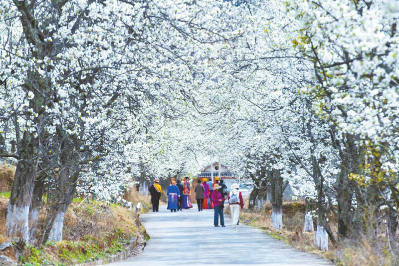 3月中旬,阿壩州金川縣的大金川河谷一帶,綿延的梨樹(shù)進(jìn)入盛花期,似雪梨花層層疊疊,當(dāng)?shù)靥厣窬予偳镀溟g,川西高原版“千里江山圖”躍然眼前。