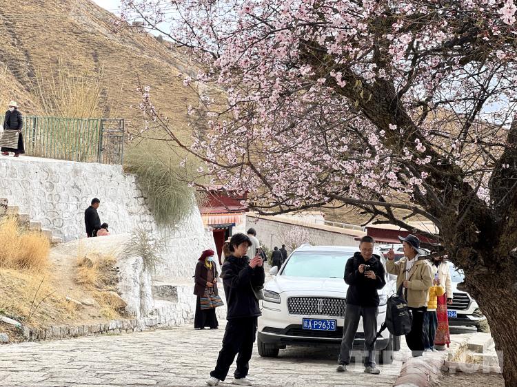 圖為帕邦喀周圍的桃花盛開,引來了諸多當(dāng)?shù)厥忻窕蛴慰图娂娗巴p花、拍照