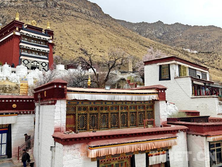 圖為帕邦喀古建筑與桃樹同框的畫面