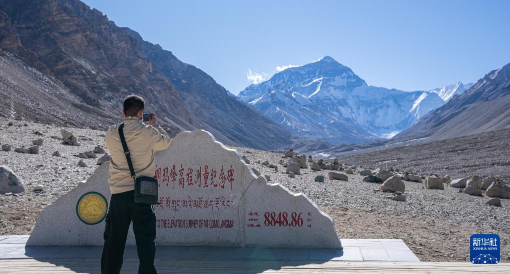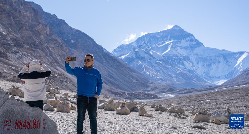 12月14日,游客在珠穆朗瑪峰高程測(cè)量紀(jì)念碑前拍照留念。新華社記者 丁增尼達(dá) 攝