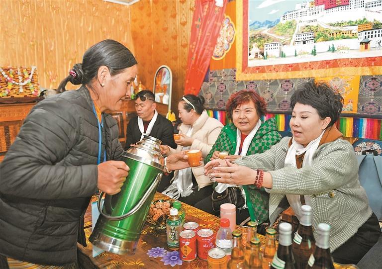 山南市乃東區(qū)扎西曲登社區(qū)的112號民宿主人剛組為游客們倒上熱乎的酥油茶。記者 旦增蘭澤 洛桑 唐斌 攝