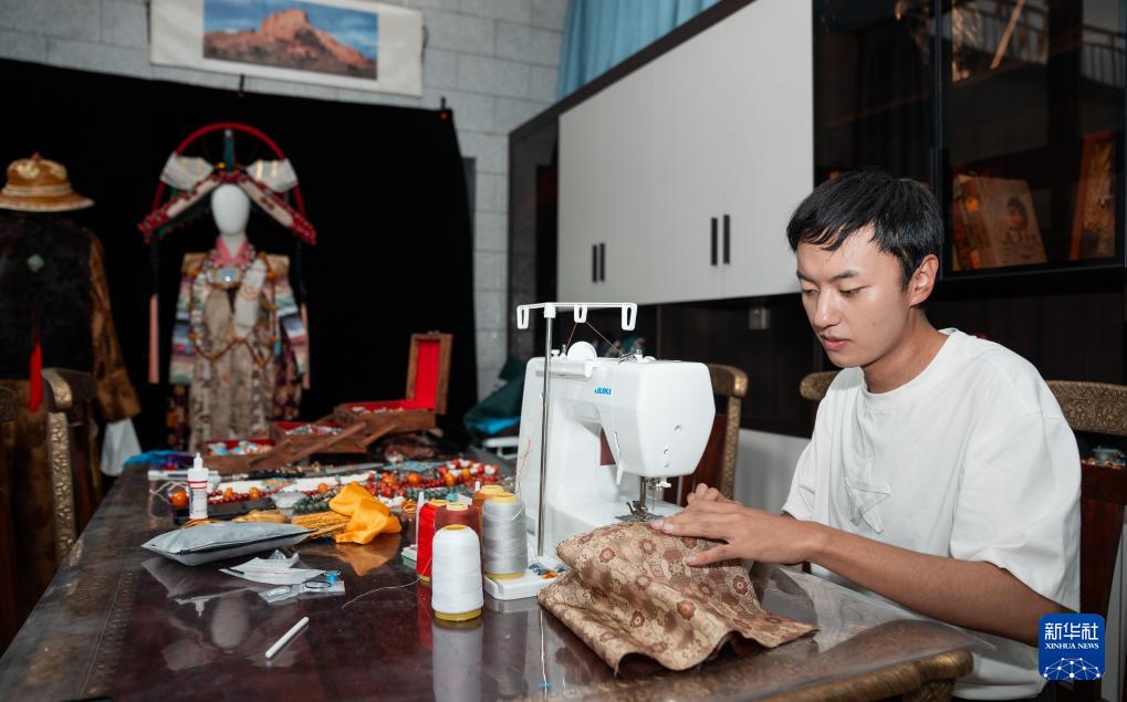 班珠丹塔在家中工作室內(nèi)縫制藏裝(9月11日攝)。新華社記者 丁增尼達 攝