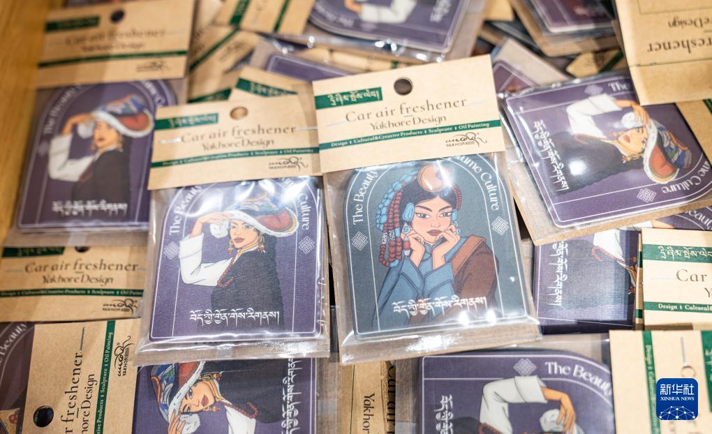 這是在西藏一家文創(chuàng)超市里拍攝的西藏雅闊熱品牌設(shè)計有限公司設(shè)計制作的藏裝主題車掛香片(9月29日攝)。新華社記者 丁增尼達 攝??