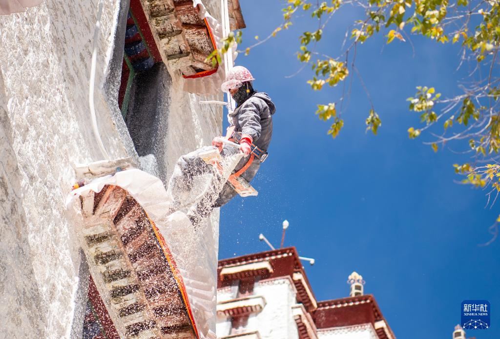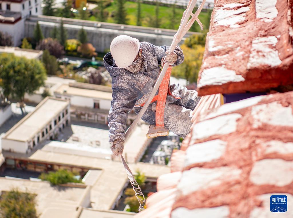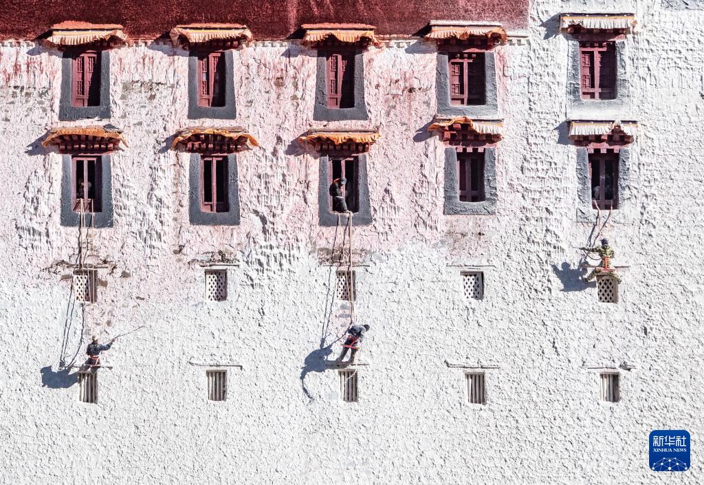 近日,西藏布達(dá)拉宮迎來(lái)一年一度的粉刷“美容”。工作人員和志愿者將粉刷材料按比例混合,經(jīng)過(guò)濾后對(duì)布達(dá)拉宮墻體進(jìn)行噴涂,讓建筑更加美觀。