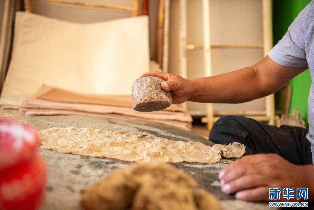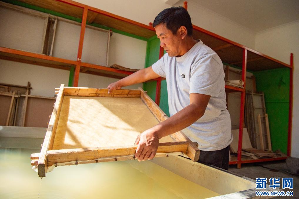 10月16日,格桑旦增的弟弟普瓊在進(jìn)行澆造、抄紙工藝。新華網(wǎng) 旦增努布 攝