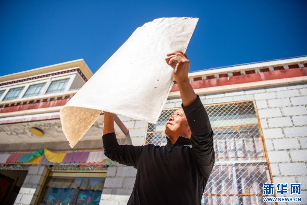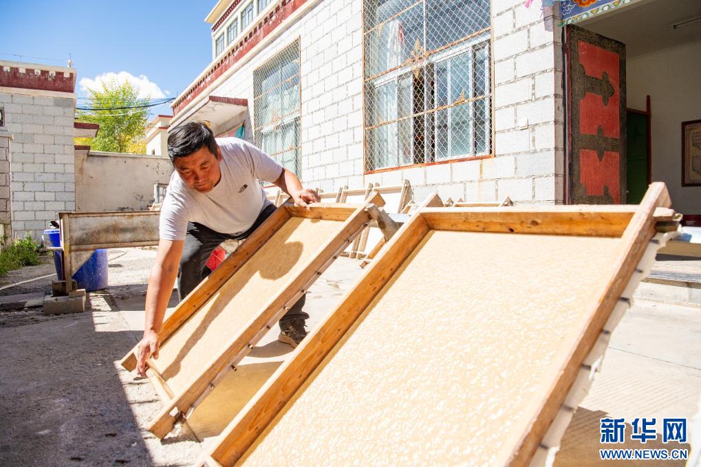 10月16日,格桑旦增的弟弟普瓊在晾曬藏紙。新華網(wǎng) 旦增努布 攝