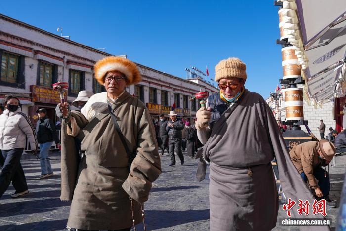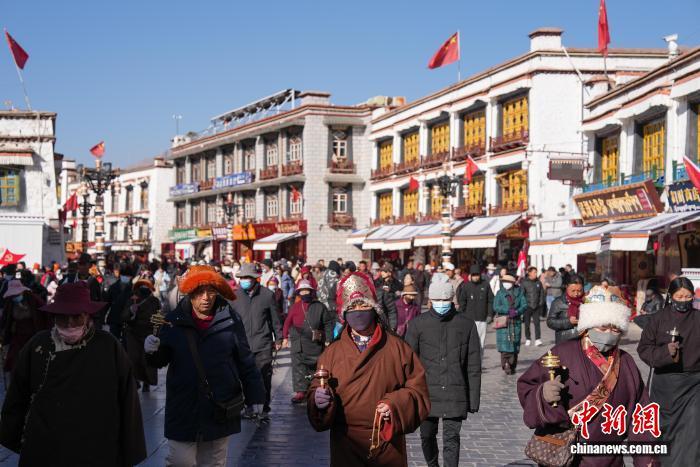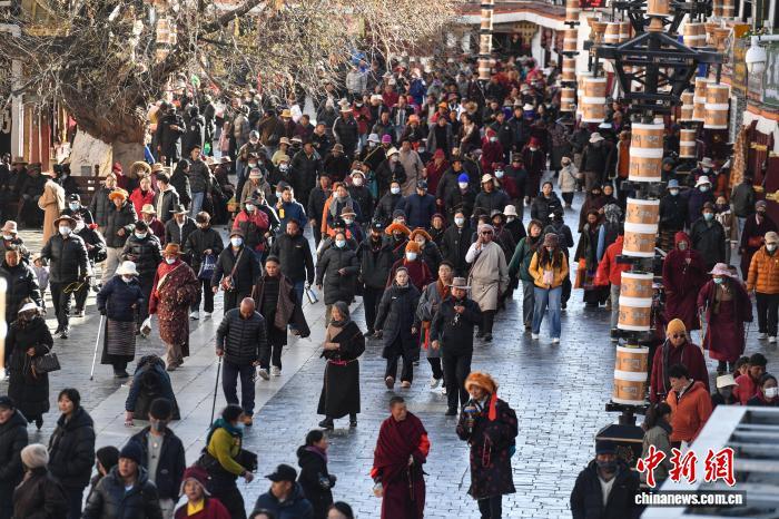 1月14日,雪域高原進入農(nóng)閑季,西藏及各地藏傳佛教信眾齊聚拉薩,圍繞布達拉宮、大昭寺等地排起長龍,轉(zhuǎn)經(jīng)朝拜、虔誠禮佛,為眾生祈福,祈求風調(diào)雨順。圖為信眾圍繞大昭寺轉(zhuǎn)經(jīng)。貢確 攝