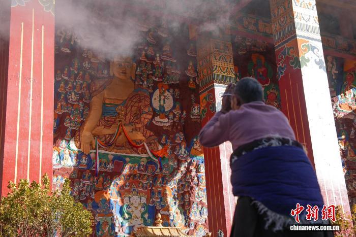 1月14日,雪域高原進入農(nóng)閑季,西藏及各地藏傳佛教信眾齊聚拉薩,圍繞布達拉宮、大昭寺等地排起長龍,轉(zhuǎn)經(jīng)朝拜、虔誠禮佛,為眾生祈福,祈求風調(diào)雨順。圖為信眾在千佛巖前磕長頭。貢確 攝