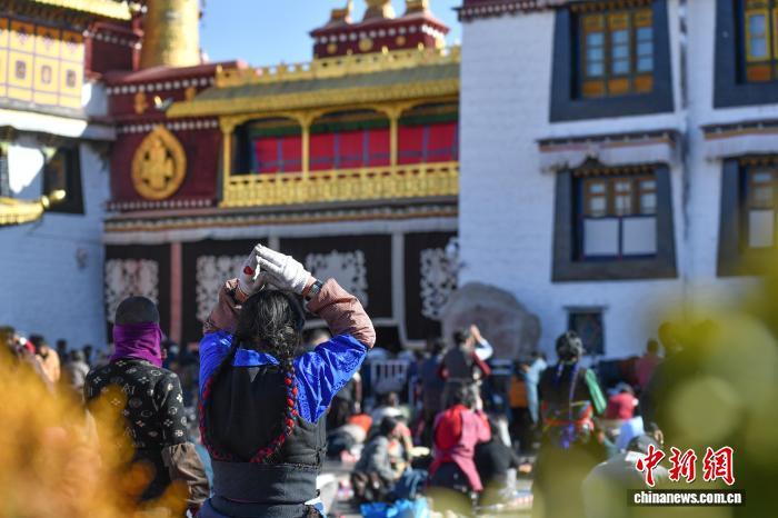 1月14日,雪域高原進入農(nóng)閑季,西藏及各地藏傳佛教信眾齊聚拉薩,圍繞布達拉宮、大昭寺等地排起長龍,轉(zhuǎn)經(jīng)朝拜、虔誠禮佛,為眾生祈福,祈求風調(diào)雨順。圖為信眾在大昭寺前磕長頭。貢確 攝