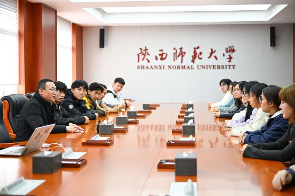 2026年1月7日,石磊(左一)在陜西師范大學(xué)與今年即將赴西藏實習(xí)的公費師范生代表交流。新華社記者 張博文 攝
