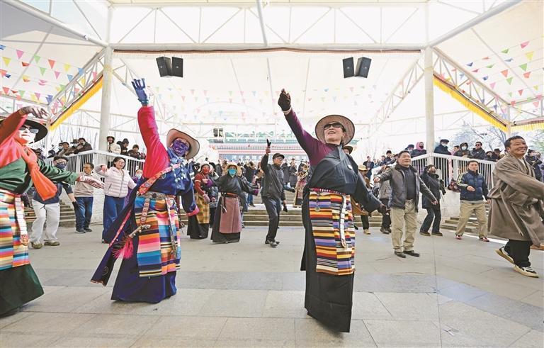 圖為近日,市民群眾正在宗角祿康公園跳鍋莊。本報記者 唐斌 攝