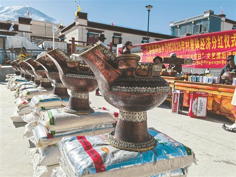 歌舞聲中迎新年,集體分紅暖新居。日喀則農(nóng)事新年期間,日喀則市定結(jié)縣郭加鄉(xiāng)乃村以米面、藏式銅制青稞酒容器等實物形式,為全村10戶群眾分紅。大家載歌載舞,共同慶祝搬入定日6.8級地震災(zāi)后恢復(fù)重建新居的首個新年。