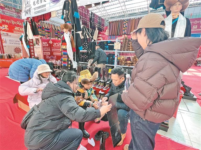 圖為市民在博覽會上為孩子選購藏帽、藏靴。本報記者 央金 攝
