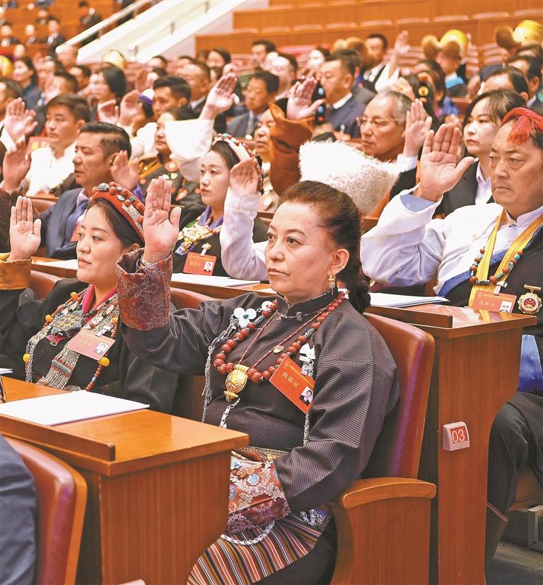 人大代表們舉手表決各項(xiàng)決議草案。本報(bào)記者 洛桑 攝