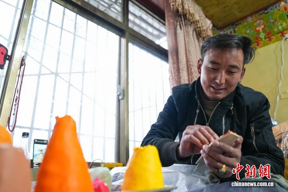 2月4日,隨著藏歷新年臨近,拉薩街頭年味漸濃,年貨市場(chǎng)上的“孜扎”迎來(lái)熱銷(xiāo)。酥油花藏語(yǔ)稱(chēng)“孜扎”,是藏歷新年吉祥物切瑪盒的重要組件,也是藏族民眾家中必備的年貨。酥油花以酥油為主要原料,由匠人純手工捏制而成,造型涵蓋佛像、人物、花卉樹(shù)木、飛禽走獸等,常見(jiàn)圖案包含吉祥八寶、和諧四瑞、長(zhǎng)壽圖等,承載著藏族民眾對(duì)新年平安吉祥、萬(wàn)事順?biāo)斓拿篮闷碓浮D為手工藝人在制作酥油花。貢確 攝