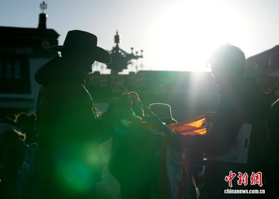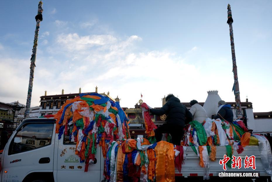 2月5日,西藏拉薩大昭寺的工作人員依據(jù)傳統(tǒng)為大昭寺周邊的5根高20多米的經(jīng)幡柱更換經(jīng)幡,迎接即將到來的藏歷新年。圖為信眾準(zhǔn)備五色哈達(dá)敬獻(xiàn)給經(jīng)幡柱。中新社記者 李林 攝