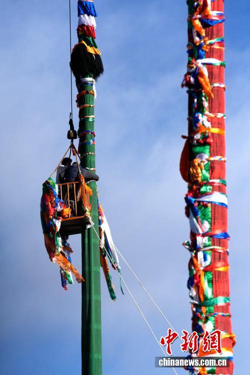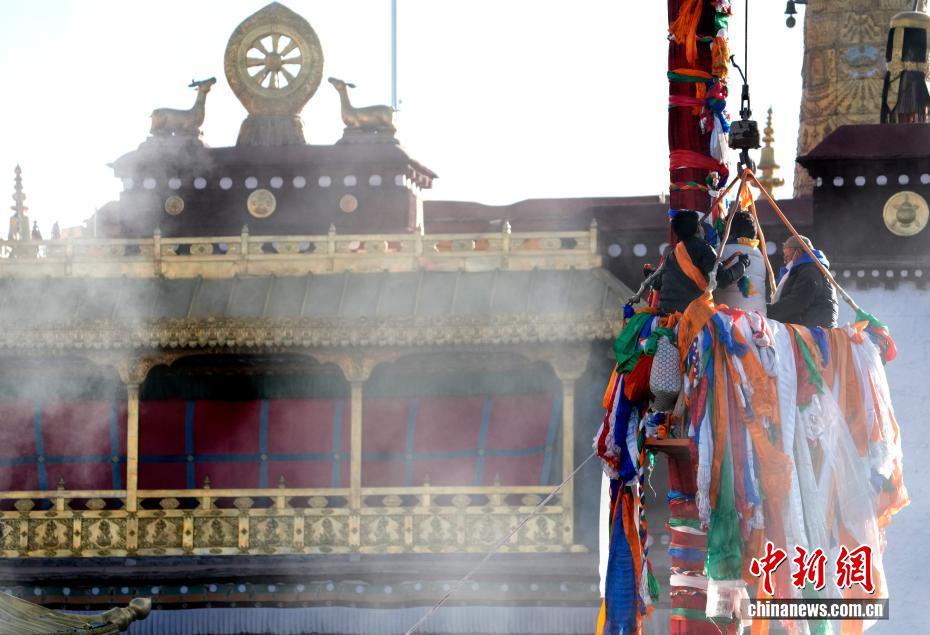 2月5日,西藏拉薩大昭寺的工作人員依據(jù)傳統(tǒng)為大昭寺周邊的5根高20多米的經(jīng)幡柱更換經(jīng)幡,迎接即將到來的藏歷新年。圖為工作人員乘坐吊車更換經(jīng)幡柱上的經(jīng)幡。中新社記者 李林 攝