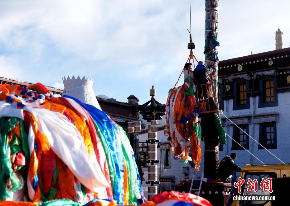 2月5日,西藏拉薩大昭寺的工作人員依據(jù)傳統(tǒng)為大昭寺周邊的5根高20多米的經(jīng)幡柱更換經(jīng)幡,迎接即將到來的藏歷新年。圖為更換經(jīng)幡儀式結(jié)束后,嶄新的經(jīng)幡柱屹立在大昭寺廣場(chǎng)。中新社記者 李林 攝