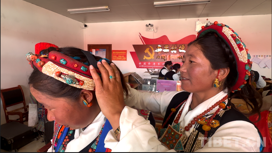 身著傳統(tǒng)服飾的曲堆“諧欽”隊(duì)演職人員在整理頭飾