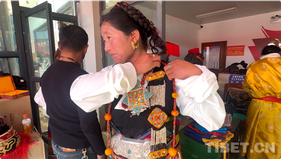 身著傳統(tǒng)服飾的曲堆“諧欽”隊(duì)演職人員在整理配飾