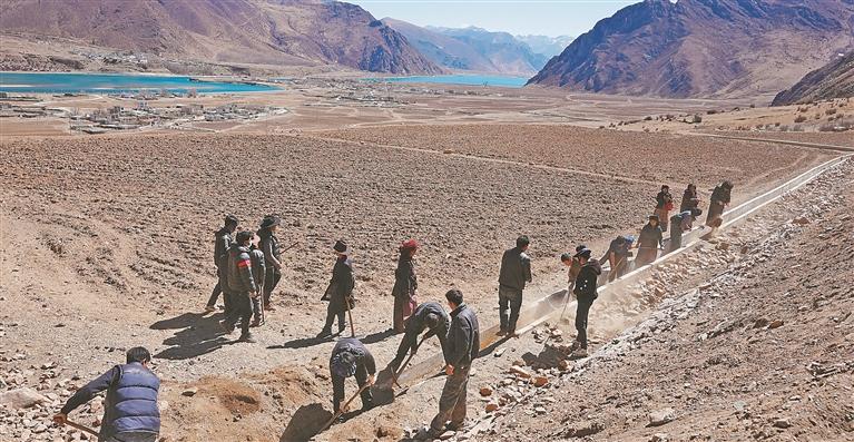 圖為墨竹工卡縣扎雪鄉(xiāng)其朗村村民正在修繕?biāo)?/span>