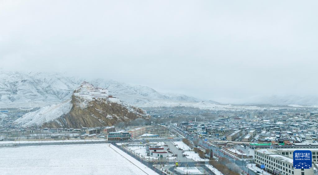 3月13日,空中俯瞰雪后的西藏日喀則市江孜縣江孜宗山古堡(無人機照片)。新華社記者 晉美多吉 攝