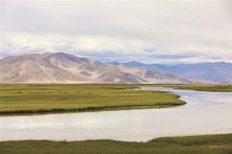遠(yuǎn)處的雪山,山峰終年積雪,陽(yáng)光在山丘上投下斑駁的光影;河水在此變得溫柔,千回百轉(zhuǎn),繞過(guò)石塊,穿過(guò)草甸;水中嬉戲的水鳥(niǎo)翩躚起舞,狂奔的藏野驢自由歡騰;草地上牛羊悠閑吃草,牧民的帳篷升起裊裊炊煙。